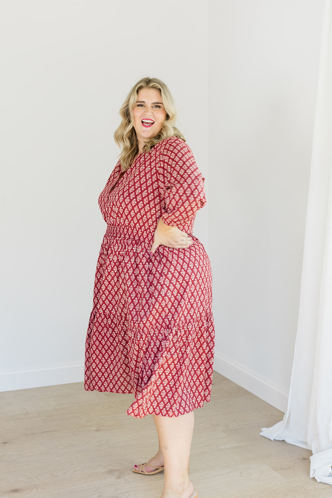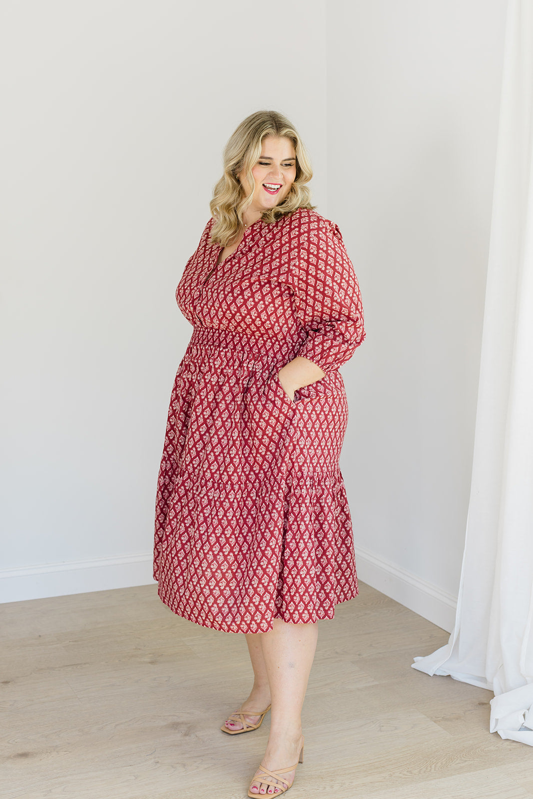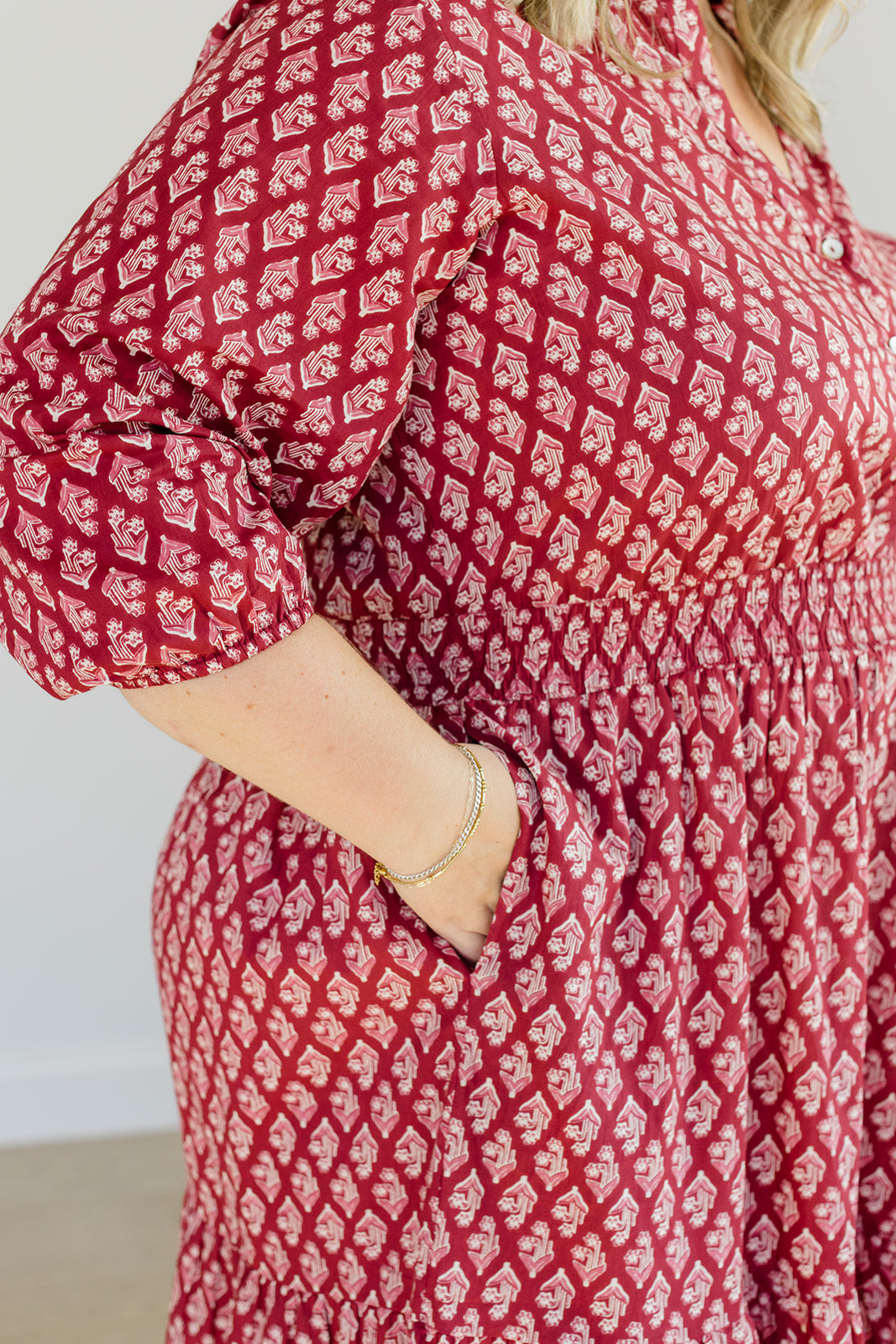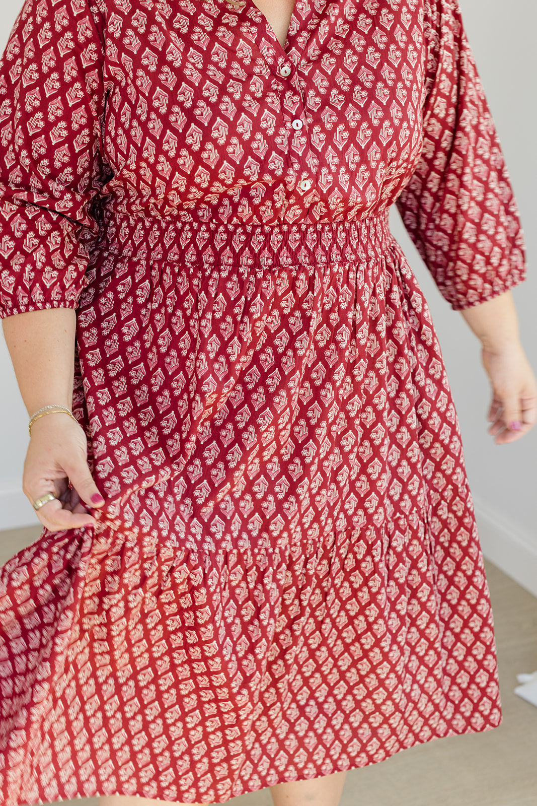Featuring a v-neckline with a functional button-up bodice, a smocked waistband that defines your shape while staying incredibly comfortable, and 3/4 sleeves with elastic cuffs for a touch of polish. The tiered midi skirt moves beautifully with every step — and yes, she has pockets.