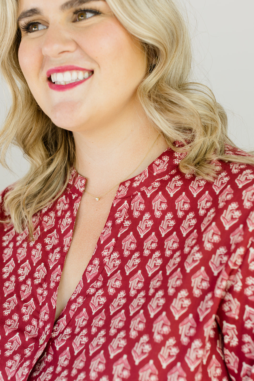 Elegant, timeless, and effortlessly wearable — The Francesca in Spiced Merlot is made for holiday gatherings, special dinners, and cozy nights in. The rich, warm dark red hue flatters every skin tone with a small geometric floral print.
